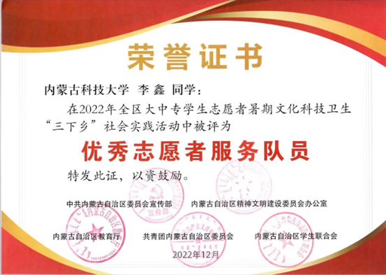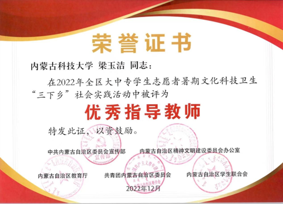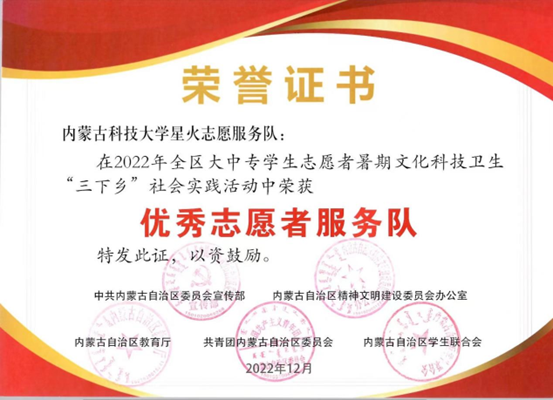 近日,中共内蒙古自治区委员会宣传部内蒙古自治区精神文明建设委员会办公室内蒙古自治区教育厅共⻘团内蒙古自治区委员会内蒙古自治区学生联合会下发了《关于表彰2022年全区大中专学生志愿者暑期文化科技卫生“三下乡”社会实践活动先进集体和优秀个人的决定》,授予pp电子游戏平台网站星火志愿服务队“优秀志愿者服务队”、授予梁玉洁老师“优秀指导教师”、授予李鑫同学“优秀志愿者服务队员”荣誉称号。