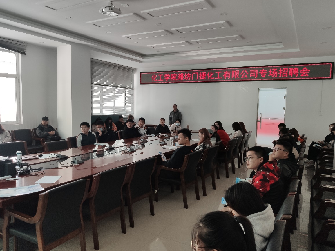 2020年10月27日10:00,在逸夫楼pp电子游戏平台网站E202会议室,召开潍坊门捷化工有限公司专场招聘。学院化学相关专业2021届毕业生30余人参加了此次招聘。