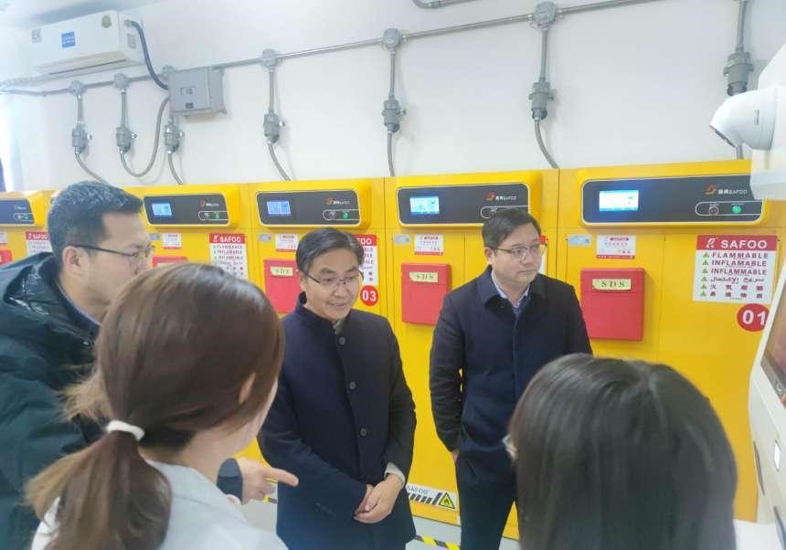 为进一步加强学校实验室危险化学品管理工作,有效预防和遏制危险化学品安全事故发生,11月28日上午,校党委委员、副校长赵永旺、实验室与设备管理处张利文处长、崔开源副处长等一行来pp电子实地调研检查危化药品库,院党委书记罗强、院长李松波及危化药品库负责人陪同检查。