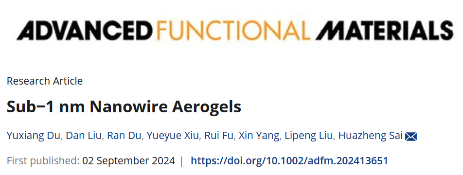 相关工作以“Sub−1 nm nanowire aerogels”为题发表在国际知名学术期刊《Advanced Functional Materials》上,pp电子硕士研究生杜玉祥、刘丹为论文共同第一作者,pp电子赛华征教授为论文的通讯作者,北京理工大学杜然教授参与部分工作。该研究工作得到了国家自然科学基金、内蒙古自治区科技计划项目等资金支持。