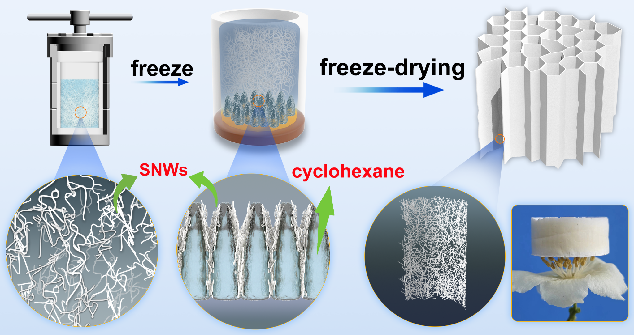针对这一挑战,pp电子赛华征教授基于SNW的独特分散性,提出了一种采用高熔点非极性溶剂(即环己烷)为介质,经冷冻铸造来制备亚纳米线气凝胶(SNWA)的方案。所制备的SNWA不仅展现了SNW大量的物理和化学性质,而且在光致发光领域具有很大的应用潜力。