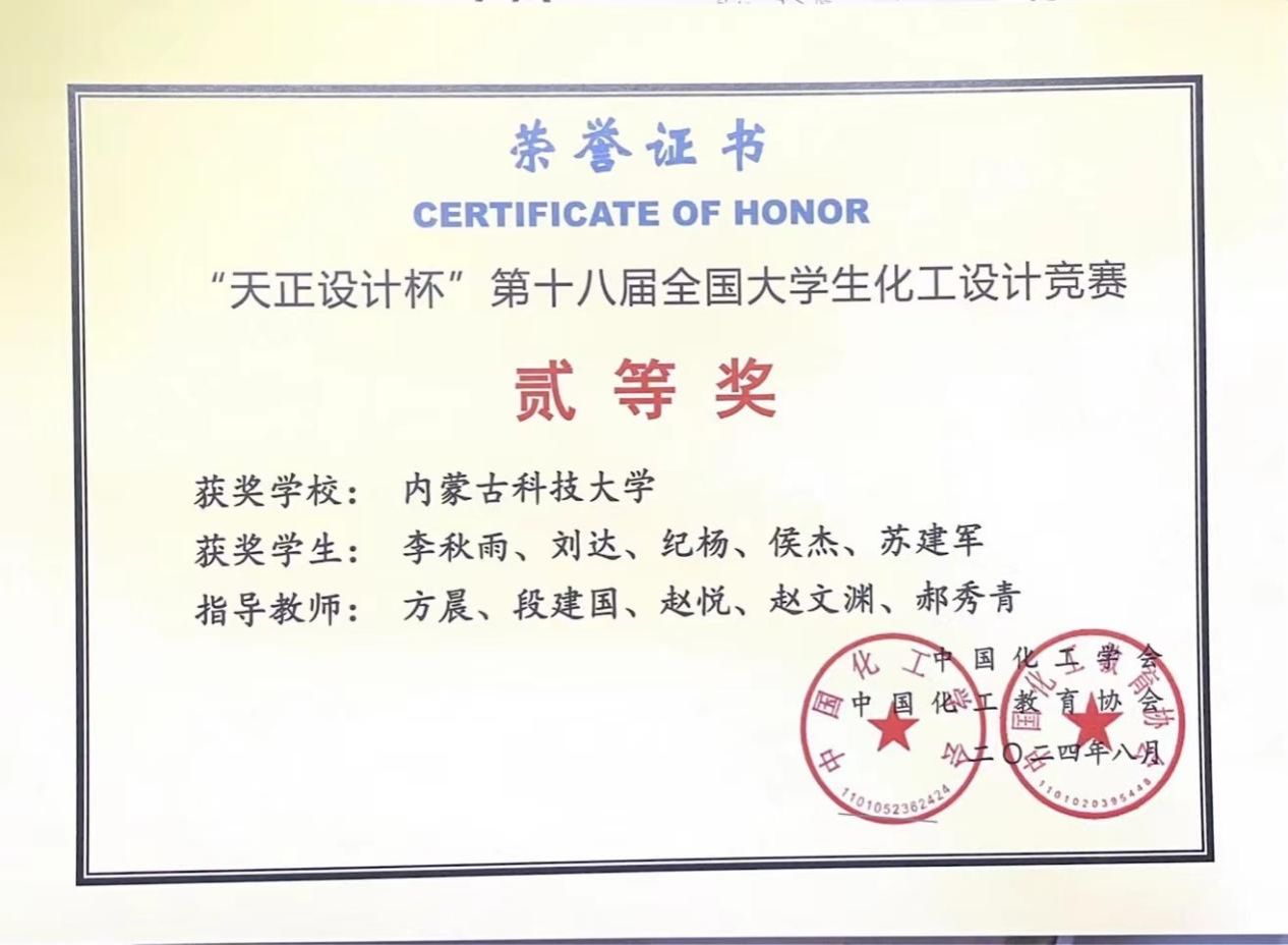 pp电子学生李秋雨、刘达、纪杨、侯杰、苏建军组成的“活力醛开,醇享未来”团队,在方晨、段建国、赵悦、赵文渊、郝秀青老师的指导下,凭借扎实和良好的工程教育素养荣获全国大学生化工设计竞赛全国二等奖、华北赛区一等奖。